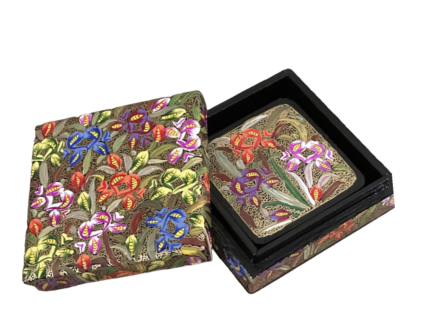 Kashmiri Paper Mache Decorative 6 Tea Coaster Set with Trinket Box . Authentic Lacquered Paper Mache Box