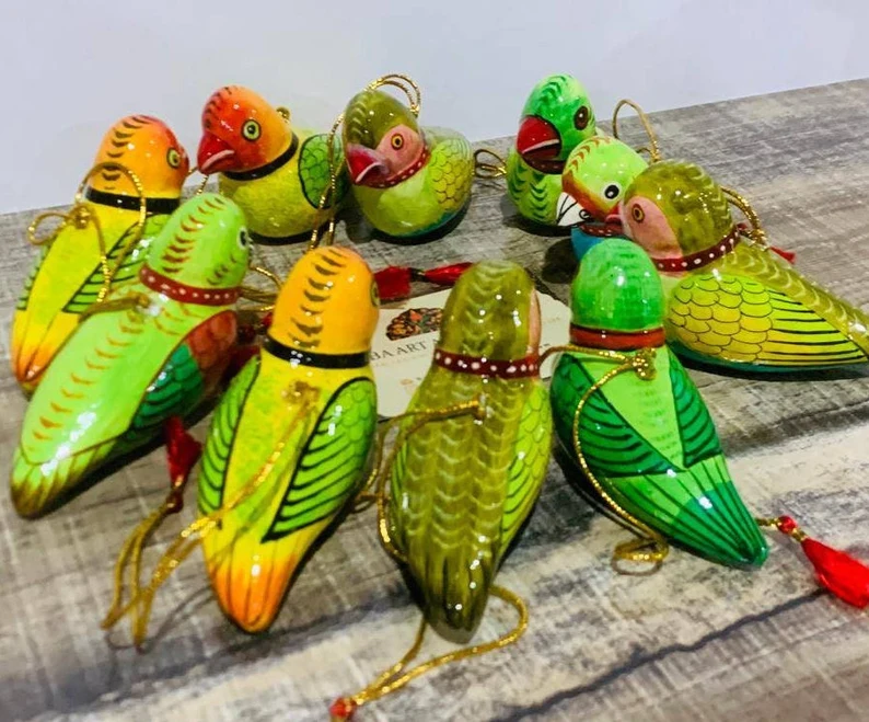 Set of 6 Hand painted parrots, Hand painted Paper mache birds, paper mache Ornaments, Handmade Christmas Baubles, Handmade Birds hangings
