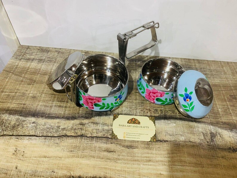 The beautiful and unique 2 compartment tiffin box is made of steel with beautiful and pretty hand painted design/work by our talented and professional artists. The tiffin is hand painted in northern part of Himalayan Kashmir.