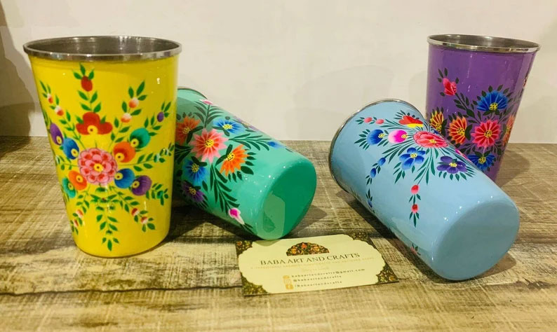 Enamelware glass, enamel ware, hand painted steel glass, Kashmir enamelware, Kashmiri handicrafts, stainless steel glass, Enamel ware utensils
