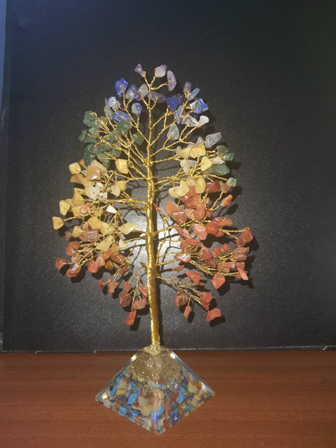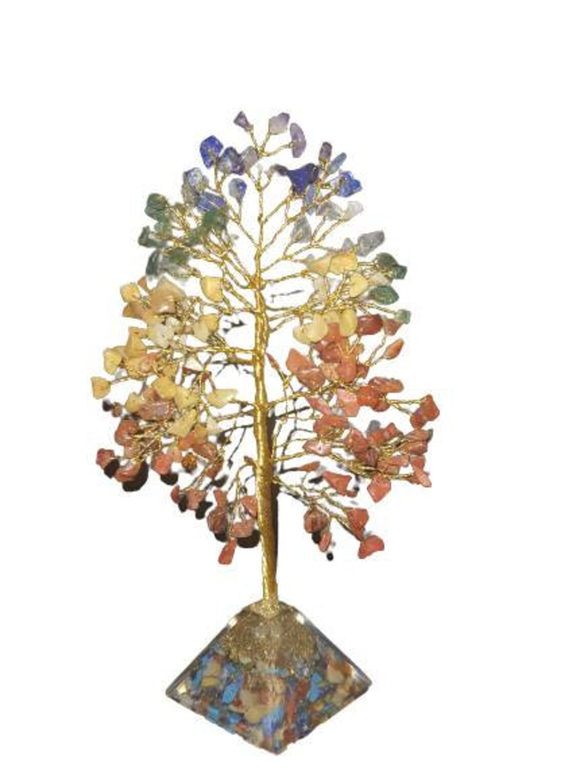 Seven Chakra balancing Crystals wired in Bonsai tree with Crystal pyramid base , Tree of life aligned with crystal clusters and Pyramid