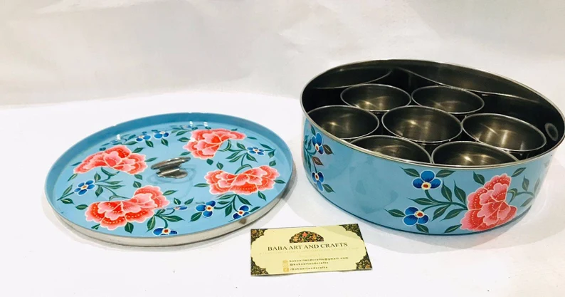 Spice Box with lid, Indian Masala Box for storing spices, Steel Spice box from India, Kashmiri Enamelware,Hand Painted masala box, spice box
